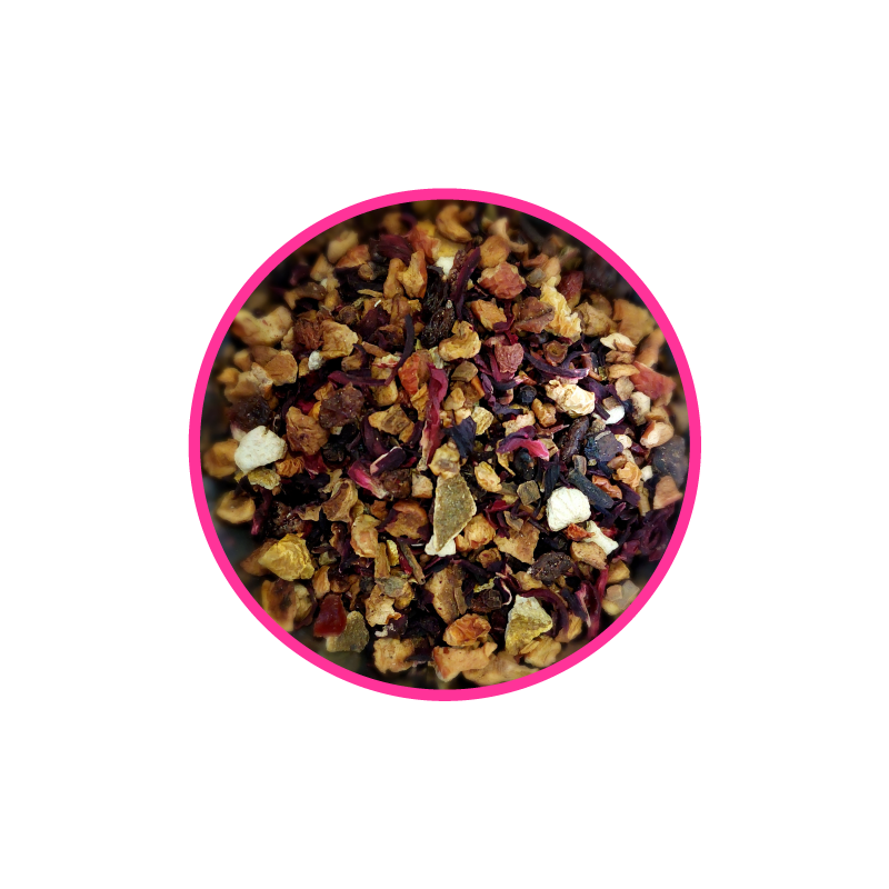 Ingrédients : Pomme*, hibiscus*, raisin*, écorces d'orange*, cynorhodon*, cannelle*, arôme naturel, clou de girofle, poivre noir*